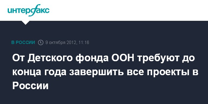 Москва. 9 октября. ИНТЕРФАКС - Российская сторона дала Детскому фонду ООН (ЮНИСЕФ) срок до 31 декабря 2012 г. на завершение в РФ всех остающихся проектов, сообщили во вторник "Интерфаксу" в Департаменте информации и печати (ДИП) МИД РФ.