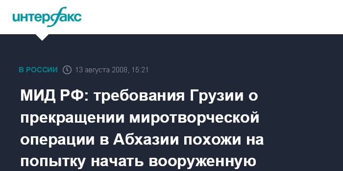 Москва. 13 августа. INTERFAX.RU - Требования Грузии о прекращении миротворческой операции в Абхазии может являться попыткой подготовить новую вооруженную авантюру против этой непризнанной республики, заявляет МИД РФ.