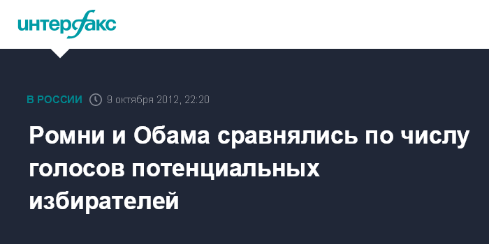 Вашингтон. 10 октября. INTERFAX.RU - Кандидат от Республиканской партии на пост президента США Митт Ромни догнал действующего главу государства Барака Обаму по числу голосов потенциальных избирателей, свидетельствуют результаты опроса, проведенного социологической службой "Ипсос".