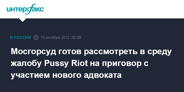 Москва. 10 октября. INTERFAX.RU - Мосгорсуд в среду вновь собирается проверить законность приговора, вынесенного участницам панк-группы Pussy Riot, осужденным на два года колонии за скандальную акцию в храме Христа Спасителя.