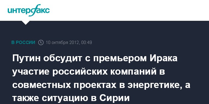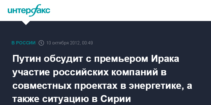 Путин обсудит с премьером Ирака участие российских компаний в совместных проектах в энергетике, а также ситуацию в Сирии