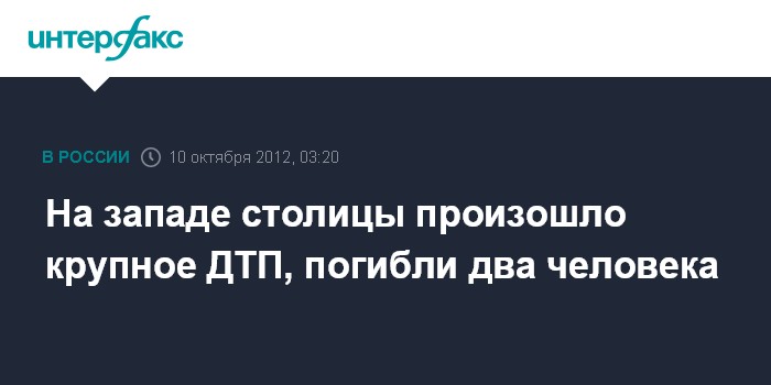 Москва. 10 октября. ИНТЕРФАКС - Два человека погибли в крупном ДТП на западе Москвы, сообщил "Интерфаксу" источник в правоохранительных органах.