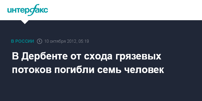 Москва. 10 октября. ИНТЕРФАКС - В результате схода сели в дагестанском Дербенте погибло семь человек, сообщили "Интерфаксу" в МЧС по региону.