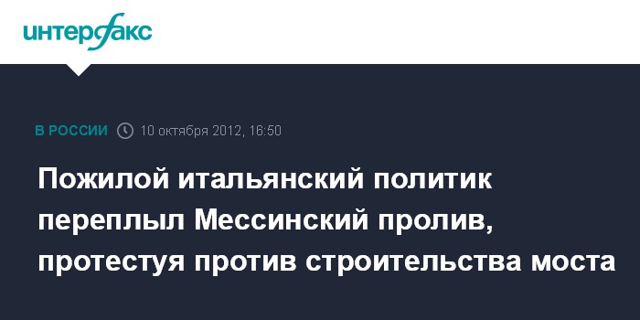 Рим. 10 октября. INTERFAX.RU - Политический деятель Италии Беппе Грилло переплыл в среду Мессинский пролив, протестуя против планов строительства моста между Сицилией и материковой Италией, сообщило агентство AFP в среду.