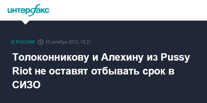 Москва. 10 октября. INTERFAX.RU - Участниц Pussy Riot Надежду Толоконникову и Марию Алехину, которых приговорили к двум годам лишения свободы за акцию в храме Христа Спасителя, в ближайшие 10 дней этапируют в колонию для отбывания срока, сообщили "Интерфаксу" в пресс-бюро Федеральной службы исполнения наказаний. Об этом сообщила "Интерфаксу" начальник пресс-бюро ФСИН Кристина Белоусова.