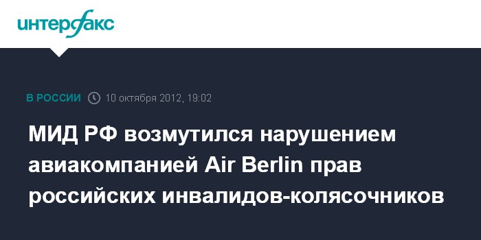 Москва. 10 октября. INTERFAX.RU - МИД России расценил отказ представителей германской авиакомпании Air Berlin посадить на борт самолета рейса Москва-Дюссельдорф группу российских инвалидов-колясочников как грубое нарушение прав и свобод человека.