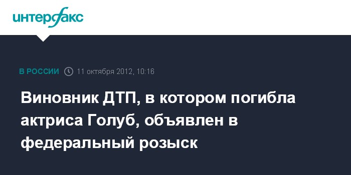 Москва. 11 октября. INTERFAX.RU - Московская полиция объявила в федеральный розыск предполагаемого виновника гибели в ДТП известной актрисы Марины Голуб, сообщили журналистам в четверг в пресс-службе столичного главка МВД.