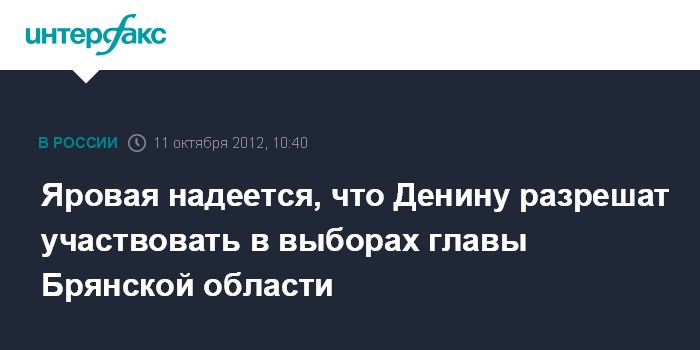 Москва. 11 октября. INTERFAX.RU - Председатель комитета Госдумы по безопасности и противодействию коррупции Ирина Яровая рассчитывает, что Верховный суд примет решение, позволяющее губернатору Брянской области, кандидату от "Единой России" Николаю Денину участвовать в выборах главы этого субъекта РФ, намеченных на 14 октября.