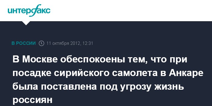 Москва. 11 октября. INTERFAX.RU - В Москве выразили обеспокоенность в связи с тем, что в результате действий турецкой стороны, принудившей к посадке сирийский пассажирский самолет, следовавший из Москвы в Дамаск, была поставлена под угрозу жизнь и безопасность пассажиров, среди которых были и россияне.