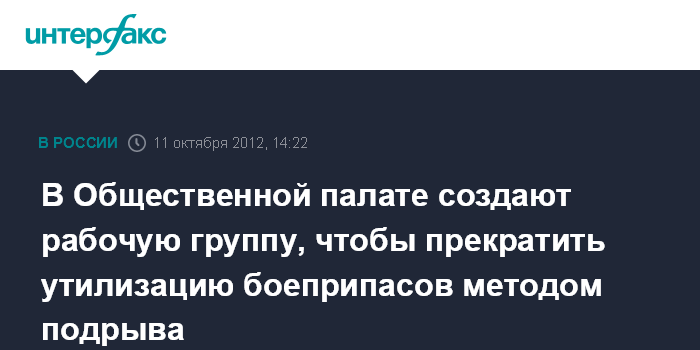 Москва. 11 октября. INTERFAX.RU - В Общественной палате РФ в экстренном порядке создается рабочая группа по отслеживанию и мониторингу утилизации боеприпасов методом подрыва, которые в настоящее время осуществляются в рамках Вооруженных сил.