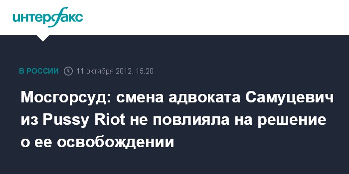 Москва. 11 октября. INTERFAX.RU - Решение участницы Pussy Riot Екатерины Самуцевич о смене защитников не повлияло на мнение Мосгорсуда о необходимости заменить ей наказание на условное.