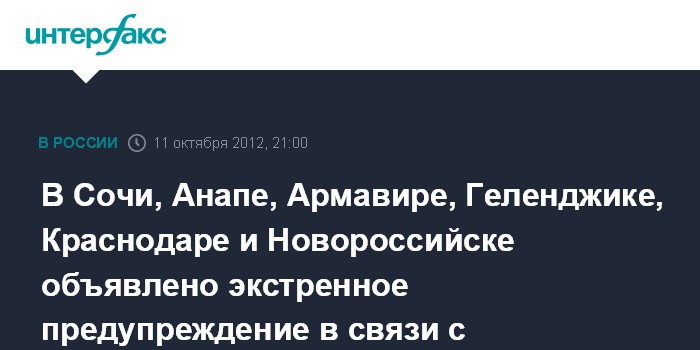 Ростов-на-Дону. 11 октября. ИНТЕРФАКС-ЮГ - В Краснодарском крае объявлено экстренное предупреждение в связи с ожидаемыми в четверг вечером и пятницу сильными осадками, сообщили в четверг агентству "Интерфакс" в пресс-службе Южного регионального центра МЧС.
