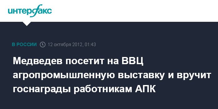 Москва. 12 октября. ИНТЕРФАКС - Премьер-министр РФ Д.Медведев выступит в пятницу на Всероссийской агропромышленной выставке "Золотая осень-2012", осмотрит выставочные павильоны и примет участие в церемонии вручения государственных наград работникам села за большой вклад в развитие сельского хозяйства и многолетний добросовестный труд.