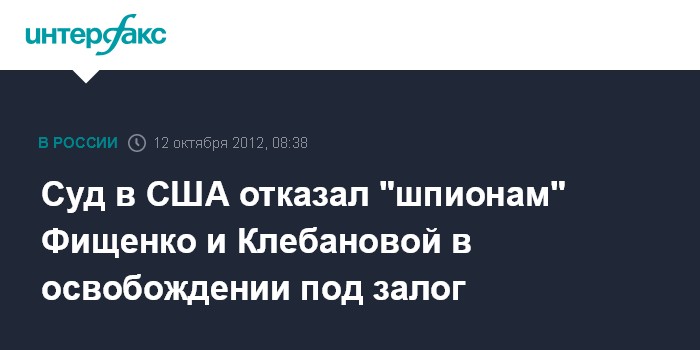 Москва/Хьюстон. 12 октября. INTERFAX.RU - Суд в американском городе Хьюстон (штат Техас) отказал в освобождении под залог Александру Фищенко и Виктории Клебановой, являющимся фигурантами дела о поставках из США в Россию микроэлектроники двойного назначения.