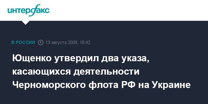 Киев. 13 августа. INTERFAX.RU - Президент Украины Виктор Ющенко утвердил порядок согласования с компетентными органами Украины передвижений, связанных с деятельностью воинских формирований Черноморского флота Российской Федерации вне мест их дислокации на территории Украины. Это определено указом президента о введении в действие решения Совета национальной безопасности и обороны от 13 августа 2008 г., текст которого размещен на официальном сайте главы государства.