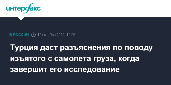 Москва. 12 октября. INTERFAX.RU - Турецкая сторона все еще продолжает исследовать характер и содержимое груза, изъятого с сирийского пассажирского самолета, летевшего из Москвы в Дамаск.