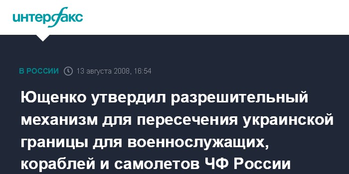 Киев. 13 августа. INTERFAX.RU - Президент Украины Виктор Ющенко утвердил своим указом решение Совета национальной безопасности и обороны от 13 августа 2008 г. "Вопросы пересечения государственной границы Украины военнослужащими, военными кораблями (судами обеспечения) и летательными аппаратами Черноморского флота Российской Федерации, находящегося на территории Украины".
