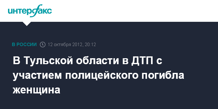 Тула. 12 октября. INTERFAX.RU - В Тульской области сотрудник полиции попал в ДТП, в результате которого погибла женщина, а сам полицейский госпитализирован, сообщили "Интерфаксу" в областном УМВД.