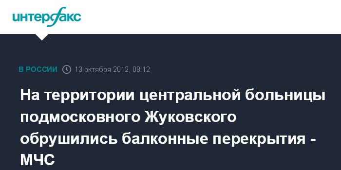 "В 7:00 мск на пульт оперативного дежурного МЧС Московской области поступило сообщение об обрушении балконных перекрытий в подмосковном Жуковском на территории ЦКБ на улице Чкалова", - сказал собеседник агентства.