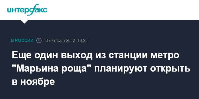 Москва. 13 октября. INTERFAX.RU - Второй выход станции столичного метрополитена "Марьина роща" планируется открыть в ноябре, сообщили в пресс-службе стройкомплекса Москвы. По словам сотрудника пресс-службы, вестибюль N2 станции находится на пересечении Шереметьевской улицы и 4-го проезда Марьиной рощи, в 30 метрах от театра "Сатирикон".