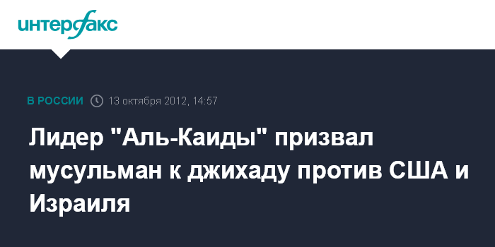 Каир. 13 октября. INTERFAX.RU - Глава "Аль-Каиды" Айман аз-Завахири обратился с призывом к мусульманам развязать "священную войну" против США и Израиля из-за выхода в Интернете антиисламского фильма "Невинность мусульман", сообщает в субботу агентство "Ассошиэйтед пресс".