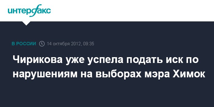 Химки. 14 октября. INTERFAX.RU - Кандидат в мэры подмосковных Химок Евгения Чирикова заявила, что в суд уже подан один иск, связанный с допущенными, по ее мнению, нарушениями выборного процесса. "Уже на сегодняшний день отмечено два нарушения, по одному уже подан иск в суд, по следующему нарушению иск сейчас мы подготовим", - заявила Е.Чирикова журналистам в воскресенье.