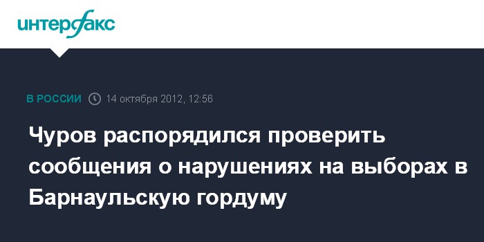 Москва. 14 октября. INTERFAX.RU - Председатель Центризбирком РФ Владимир Чуров поручил проверить информацию о нарушениях на выборах в Барнаульскую городскую думу.