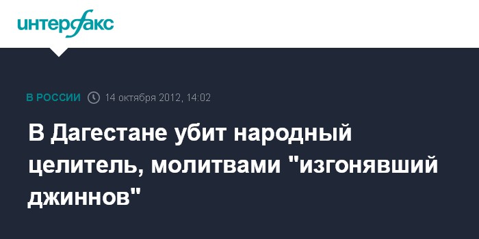 "Убит местный житель Исмаил Гаджиев, 1952 года рождения. По предварительным данным, убитый занимался народной медициной и представлялся человеком, изгоняющим джиннов", - сказал представитель СУ СКР по Дагестану. Возбуждено уголовное дело по ст. 105 (убийство) и 222 (незаконный оборот оружия) УК РФ.
