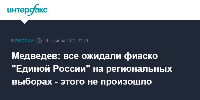 Москва. 14 октября. ИНТЕРФАКС - Премьер-министр РФ Дмитрий Медведев заявил, что ожидания тех, кто прогнозировал фиаско "Единой России" на региональных выборах, не оправдались.