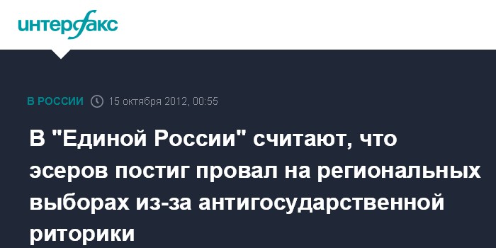 "Решив в декабре 2011 года возглавить волну протеста, "эсеры" метили не в оппонентов, а в политическую систему в целом, перейдя на антигосударственную риторику", - сказал А.Чеснаков "Интерфаксу", комментируя худшие по сравнению с декабрьскими выборами в Госдуму результаты "эсеров" на прошедших в воскресенье выборах.