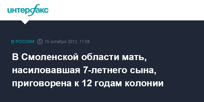 Смоленск. 15 октября. INTERFAX.RU - Суд приговорил 30-летнюю местную жительницу, признанную виновной в совершении насильственных действий сексуального характера в отношении своего малолетнего сына, к 12 годам лишения свободы с отбыванием в колонии общего режима, сообщила "Интерфаксу" в понедельник старший помощник руководителя следственного управления СК по Смоленской области Наталья Хомутова.
