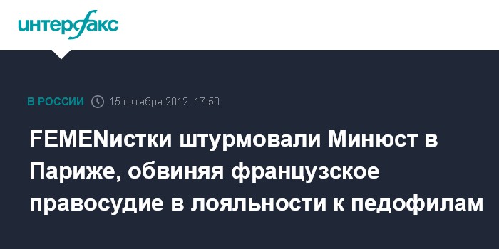 Киев. 15 октября. INTERFAX.RU - Активистки женского движения FEMEN в понедельник пытались прорваться в Министерство юстиции Франции, обвиняя французское правосудие в выгораживании насильников несовершеннолетних девочек.