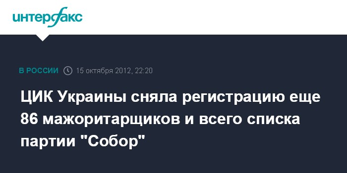 Киев. 15 октября. INTERFX.RU - Центральная избирательная комиссия (ЦИК) отменила регистрацию еще 86 кандидатов-мажоритарщиков, одного кандидата из списка Всеукраинского объединения "Свобода" и всего партийного списка партии "Собор" целиком.
