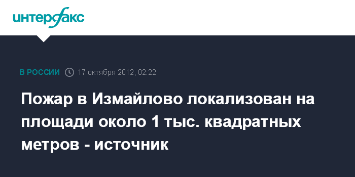 Москва. 17 октября. ИНТЕРФАКС – Пожар в вернисажном комплексе в Измайлово на востоке Москвы локализован, сообщил "Интерфаксу" источник в правоохранительных органах.