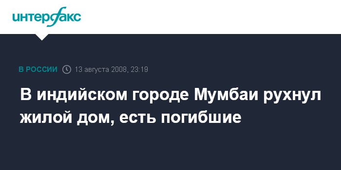 Дели. 13 августа. INTERFAX.RU - По меньшей мере 20 человек, в том числе восемь детей, погибли и более 20-и получили травмы при обрушении части четырехэтажного дома на юге индийского города Мумбаи (штат Махараштра), сообщает в среду веб-сайт газеты "Таймс оф Индиа". Спасательным операциям мешают проливные дожди и слишком узкие пути подъезда к зданию.