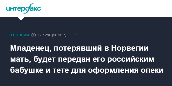 Москва. 17 октября. INTERFAX.RU - Ребенка убитой в Норвегии россиянки передадут его бабушке и тете, сообщает уполномоченный при президенте РФ по правам ребенка Павел Астахов.