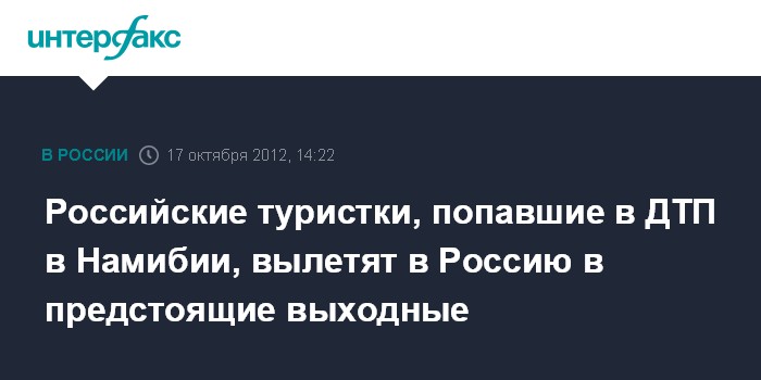 Москва. 17 октября. INTERFAX.RU - Две россиянки, пострадавшие в ДТП в Намибии, вылетят на родину предположительно в конце недели в сопровождении медработника, сообщили в консульском отделе посольства РФ в Намибии в среду.