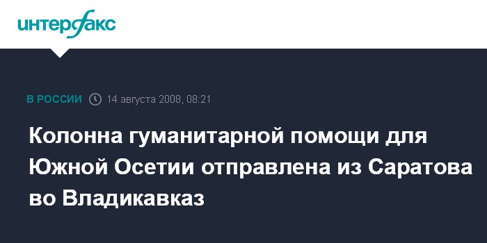 Саратов. 14 августа. INTERFAX.RU - Колонна с гуманитарной помощью населению Южной Осетии выдвинулась из Саратова во Владикавказ в четверг в 5:00 мск, сообщает областной оперативный штаб по оказанию гуманитарной и иной помощи пострадавшим.