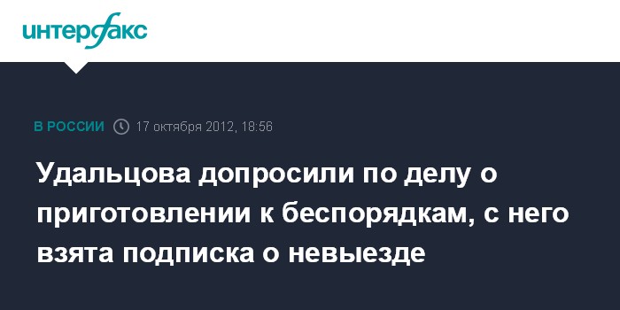 Москва. 17 октября. INTERFAX.RU - Координатор "Левого фронта" Сергей Удальцов отпущен под подписку о невыезде после допроса в качестве подозреваемого, сообщает Следственный комитет России.