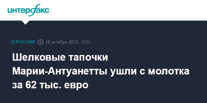 Париж. 18 октября. INTERFAX.RU - Пара зеленых с розовым шелковых тапочек французской королевы Марии-Антуанетты ушла с молотка за 62460 евро 17 октября, через день после 219-й годовщины ее казни.