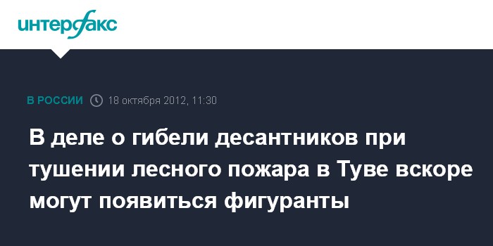 Кызыл. 18 октября. INTERFAX.RU - Уголовное дело о гибели восьми пожарных-парашютистов при тушении лесного пожара в Туве в июне текущего года имеет судебную перспективу, сообщили агентству "Интерфакс" в республиканском СУ СКР в четверг.