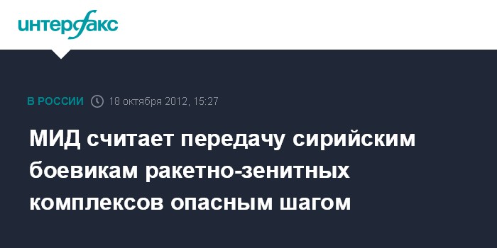 Москва. 18 октября. INTERFAX.RU - Официальный представитель МИД РФ Александр Лукашевич назвал опасным шагом передачу сирийским оппозиционерам переносных ракетно-зенитных комплексов, поставляемых, по сообщениям СМИ, мятежникам из-за рубежа.