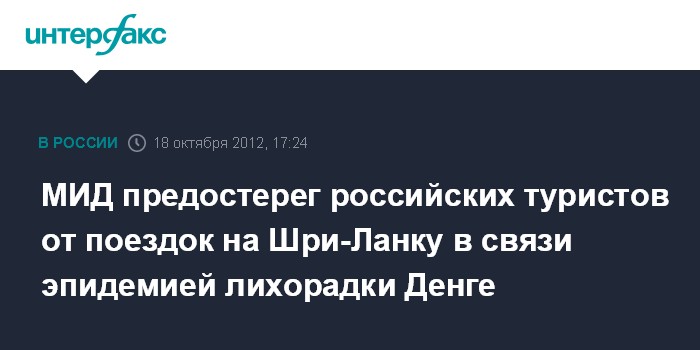Москва. 18 октября. INTERFAX.RU - МИД России призывает россиян, планирующих поездки на Шри-Ланку, соблюдать меры предосторожности в связи с эпидемией геморрагической лихорадки в этой стране.
