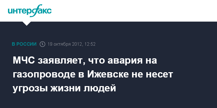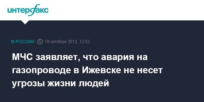 Ижевск. 19 октября. INTERFAX.RU - Угрозы жителям в связи с аварией на газопроводе в Ижевске нет, сообщила "Интерфаксу" руководитель пресс-службы ГУ МЧС России по Удмуртии Наталья Кудряшова.