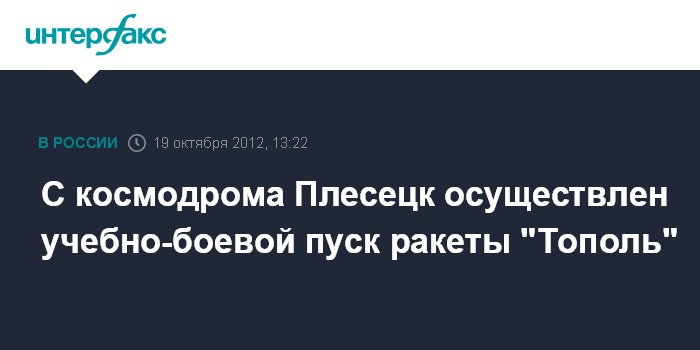 Москва. 19 октября. INTERFAX.RU - Межконтинентальная баллистическая ракета "Тополь" стартовала в пятницу с космодрома Плесецк (Архангельская область), сообщили "Интерфаксу" в оборонно-промышленном комплексе.