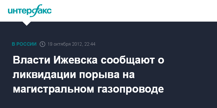 Ижевск. 19 октября. ИНТЕРФАКС-ПОВОЛЖЬЕ - Авария на магистральном газопроводе в Ижевске ликвидирована, началось подключение к газу крупных промышленных предприятий города, сообщил журналистам в пятницу поздно вечером исполняющий обязанности главы администрации Ижевска Александр Прозоров.