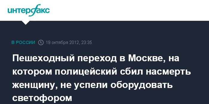 Москва. 19 октября. ИНТЕРФАКС - Пешеходный переход, на котором в пятницу вечером сотрудник полиции насмерть сбил женщину и травмировал еще двух людей, в ближайшем времени должен быть оборудован светофором.