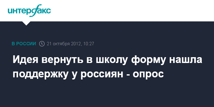 Москва. 21 октября. INTERFAX.RU - Большинство россиян (68%) одобряет идею введения школьной формы: 39% считают, что она должна быть единой для всех школ страны, а 29% полагают, что каждому учебному заведению нужна своя форма. Таковы данные опроса портала Superjob.ru, проведенного в конце сентября среди 1600 россиян.