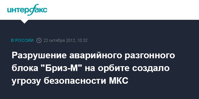 Москва. 22 октября. INTERFAX.RU - Разгонный блок "Бриз-М", виновный в августовской аварии космических аппаратов "Экспресс-МД2" и Telkom 3, разрушился на околоземной орбите, и теперь его обломки представляют потенциальную угрозу безопасности Международной космической станции (МКС), сообщил "Интерфаксу-АВН" источник в ракетно-космической отрасли.