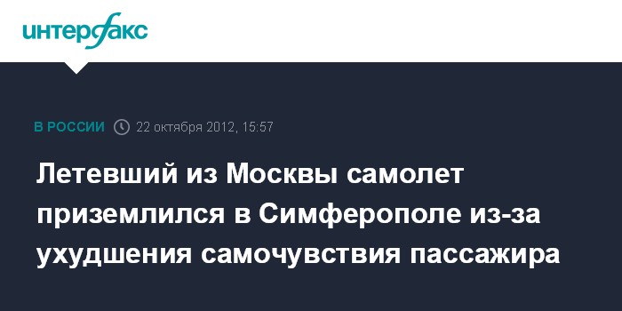 Киев. 22 октября. INTERFAX.RU - В аэропорту Симферополя (АРК) совершил вынужденную посадку самолет, выполнявший рейс Домодедово (РФ) - Шарм-эль-Шейх (Египет) из-за того ухудшившегося самочувствия одного из пассажиров, гражданина России.